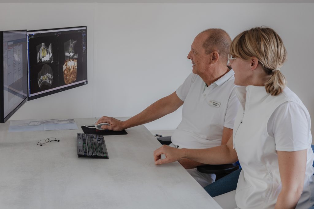 Wij kunnen met behulp van een 3D-röntgenscan (een CBCT) een exact beeld van het aanwezige botvolume vormen. En door deze scan te combineren met de digitale scan in de mond kunnen we ervoor zorgen dat we de plaats van het implantaat heel precies kunnen plannen. En dat zorgt dan voor de optimale functie en esthetiek.